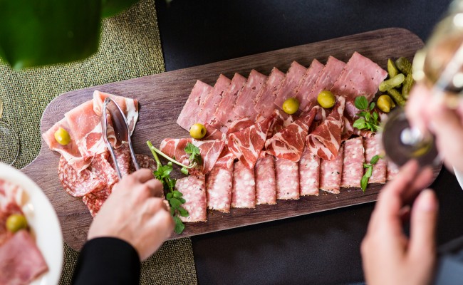 内定者との懇親会ということで若い方が多くいらっしゃるので、通常オプションの握り寿司、シャルキュトリ、ポテトパレードが標準ラインナップされた、ボリューミーなプランをお選びいただきました。やはり握り寿司は年齢を問わず人気が高く、また、乾杯用にご注文いただいたシャンパンとの相性抜群のシャルキュトリも人気でした。